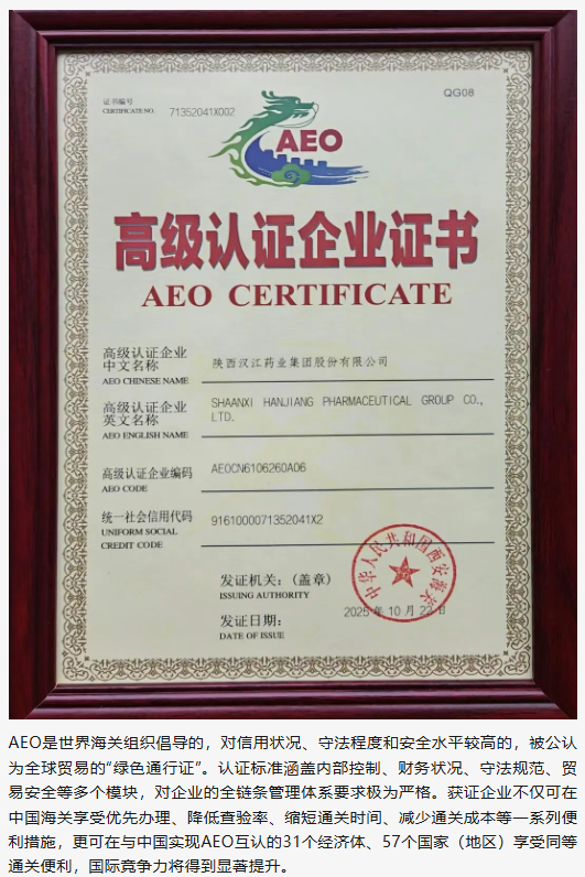 12月17日下午,陜西漢江藥業集團股份有限公司隆重舉行海關AEO(Authorized Economic Operator,經認證的經營者)高級認證授牌儀式,標志著公司再次正式躋身中國海關信用管理體系最高等級行列,成為陜南地區目前唯一在冊的海關AEO高級認證企業。